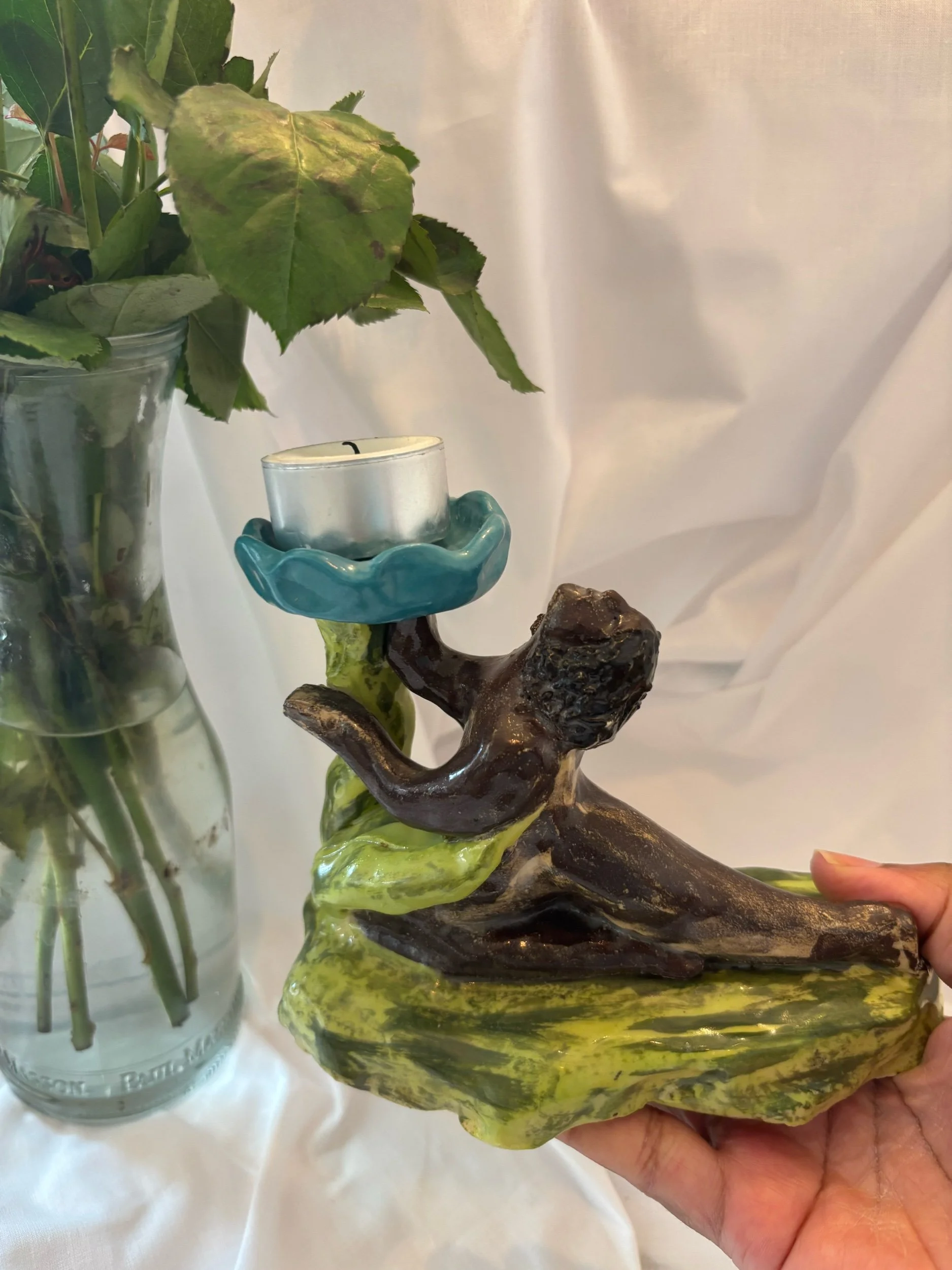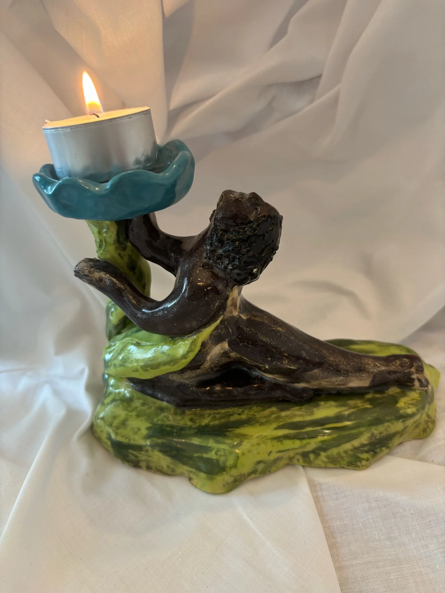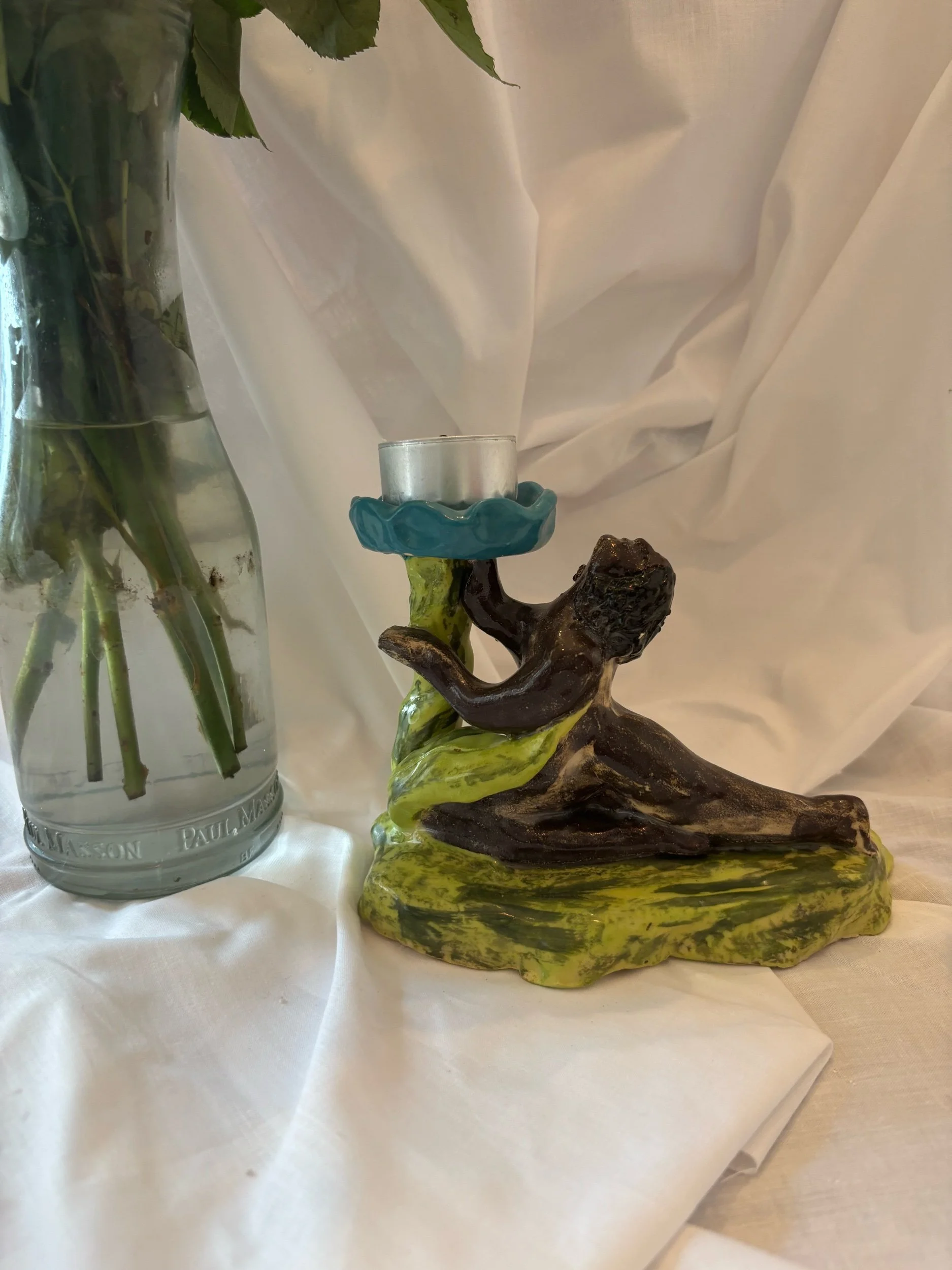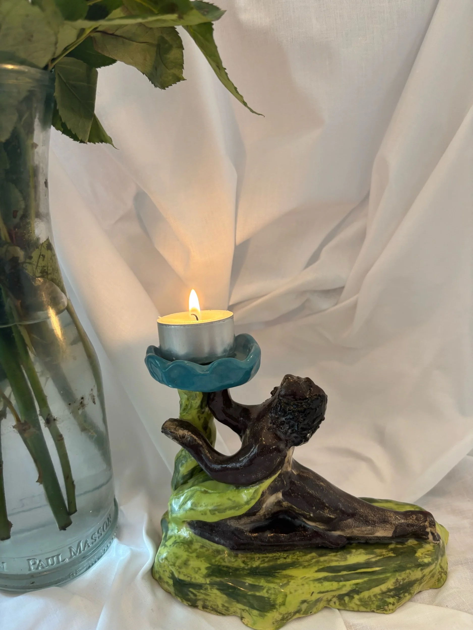 Inspired by long a summer hikes, this candle holder is handmade from stoneware clay and delicately painted with a memories of spinning around in the sunshine. A one of a kind candleholder, perfect for cosy dinner parties all year round.